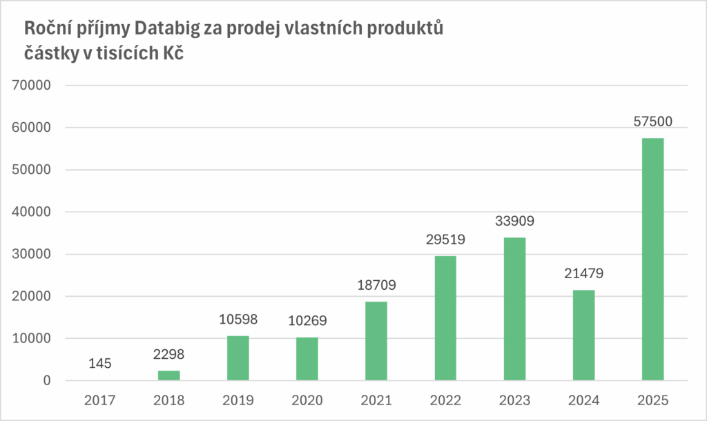 V současnosti se společnost Databig s.r.o. úspěšně věnuje vývoji svého produktu a jeho dodávkám a integraci do technologických celků u zákazníků, který o tento produkt mají zájem. Jak je společnost úspěšná, dokládá následující graf vývoje tržeb za vlastní vyvinuté produkty do roku 2019, kdy meziročně Databig s.r.o. roste o více jak 400 % (!).